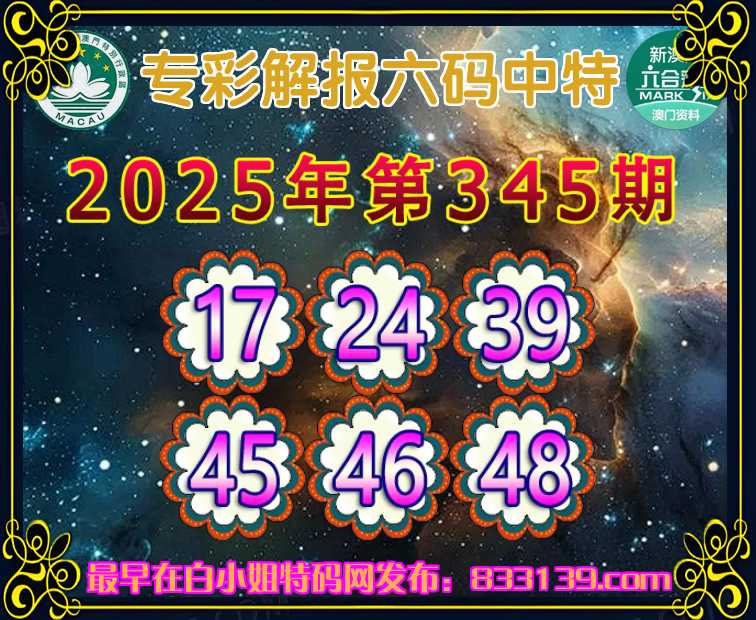 345期:《专彩解报》 六码中特【17.24.39.45.46.48】开:24